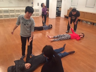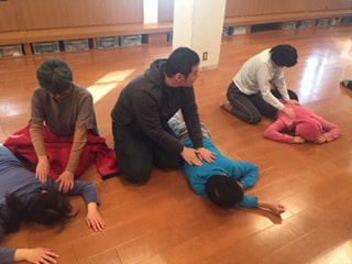 “脱力”は、ペアを組んで、仰向けにゆったりと寝ている相手の腕や足の重さを丁寧に確かめていきます。重さを感じて揺すられると、からだの中が柔らかく揺れて、相手に身を任せることで、からだもこころもほぐれていきます。