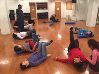 “バランス運動”は、フォームローラーという円柱の用具を使い、転がりやすい円柱の上に上向きに寝たり、身体の部位をのせ、ゆすることでからだを整えバランス感覚を鍛えます。