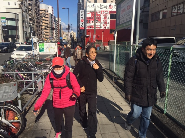 10時に皆で新大阪を出発し、天神橋筋商店街に向かい、往復7kmの道を、片道約1時間余りかけて、スタッフメンバー合わせて12人で歩きました。